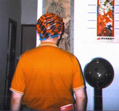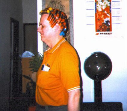 I picked out a curly style from one of the style books at the salon. She washed my hair, and set it mainly in orange rollers, but with some larger yellow and buff ones on the top. It was then under the dryer for me, and I am typing this on my laptop from there.